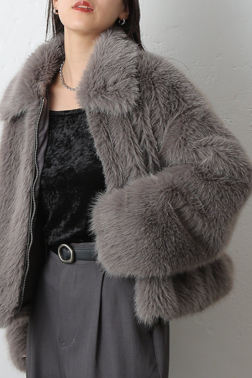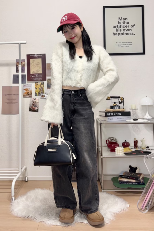 定番のジーンズとムートンシューズですが、フェミニンでシルエットがきれいなファートップスを合わせることで、カジュアルさもかわいらしさも表現できていますね。