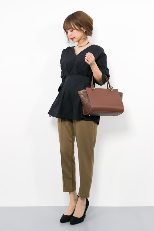 シンプルなタックパンツも、トップスや合わせる小物で、オフィスシーンで活躍するしっかり感のあるコーデに。