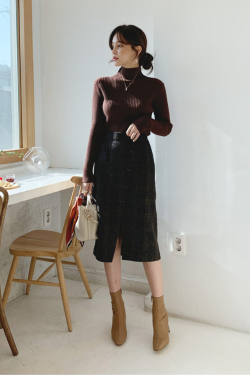伸縮性あるリブニットを使用しており、スラックスやコートに合わせるだけで大人っぽい着こなしが完成します。