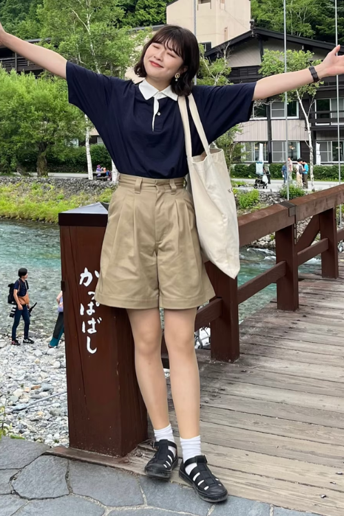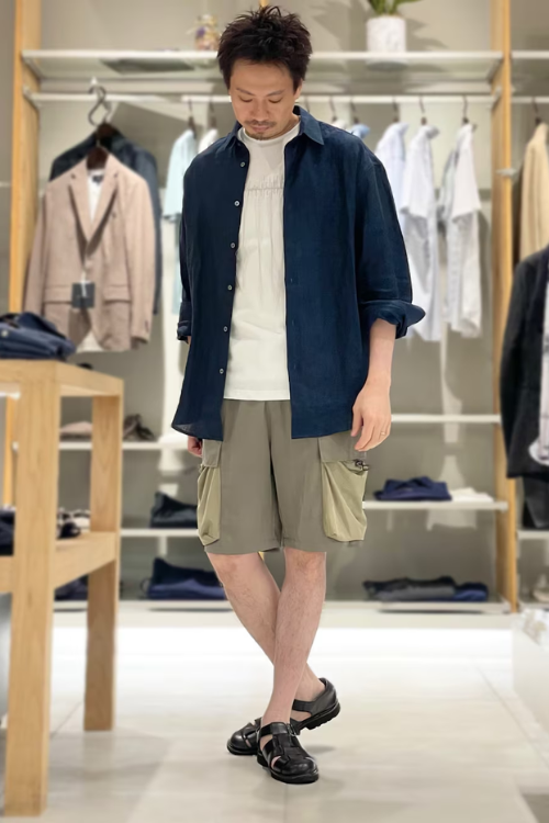 王道の短パンに合わせると、リラックスしながらも、大人の余裕と品の良さを感じさせてくれます。