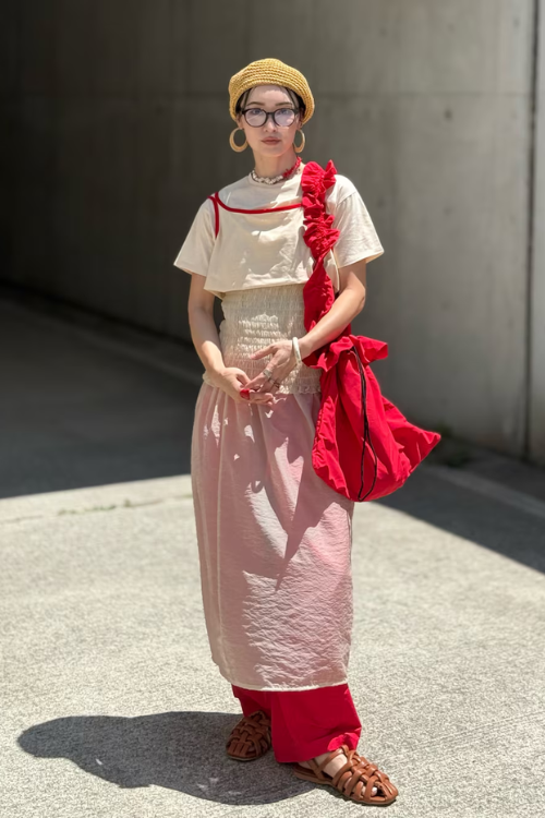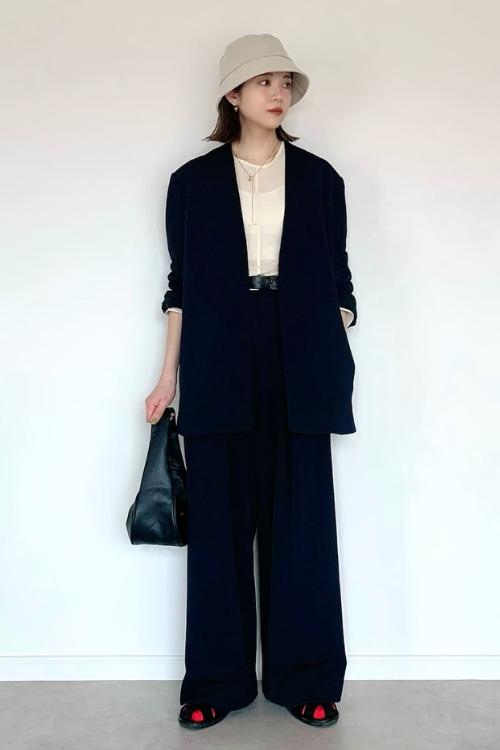 きれいめなセットアップに合わせて品の良いきちんと感を出しながらも、小物で遊びをプラスしていますね。