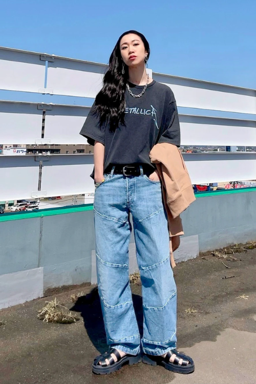 個性的なスタイルにも引けを取らず、足元からしっかりとした存在感を感じますね。
