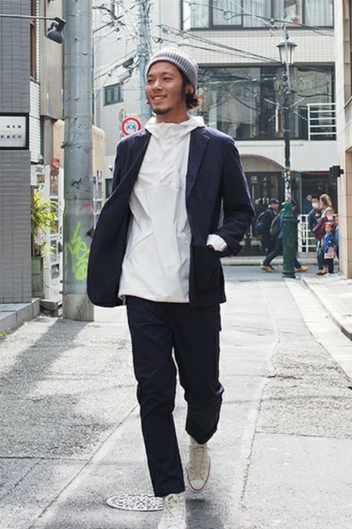 しっかり感のあるジャケットスタイルに組み合わせると、ほどよくラフ感も出る大人の休日コーデになっていますね。