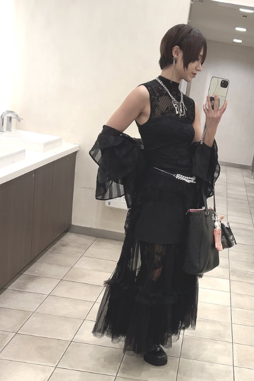 腕の大胆な肌見せとレース部分のさりげない透け感が、モード感に程よくフェミニンさをプラスしたおしゃれコーデになっています。