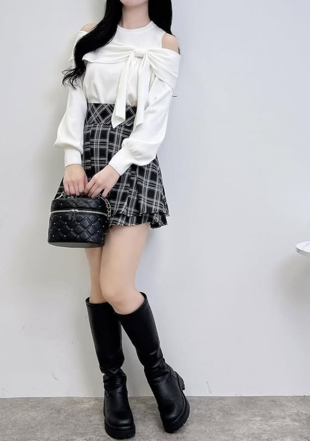 オフショルニットがフェミニンでやわらかな雰囲気を与えていて、大人のガーリースタイルにぴったりです。