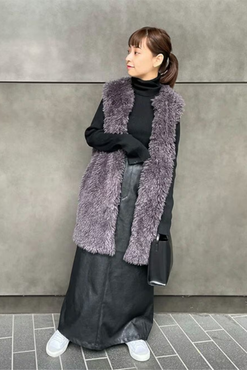 真冬はダウンのインナーにしてもかさばらず、サイドスリットが程よい抜け感を演出。