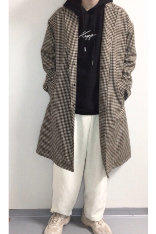 スポーツウェアとは違った印象のパーカーは、コートと合わせるとスタイリッシュな都会的な雰囲気になっていますね。