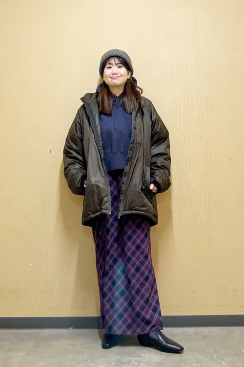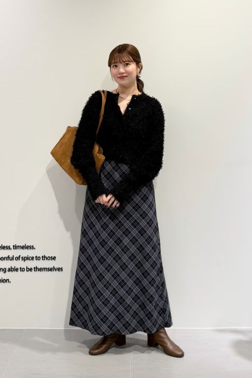 クラシカルなチェック柄ロングスカートが主役のコーディネートです。