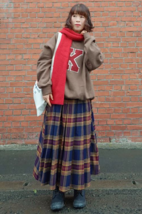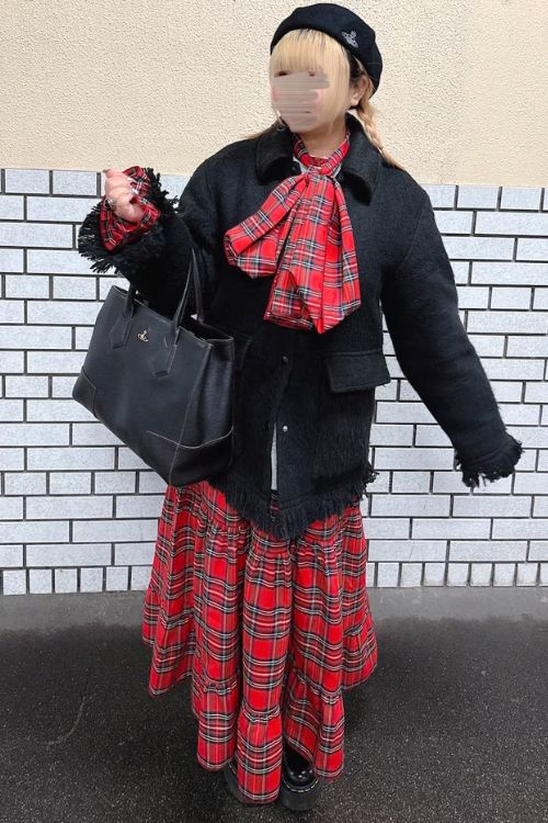 レトロな赤チェックのワンピースは、そのほかのアイテムを黒で統一してメリハリあるスタイリングになっています。