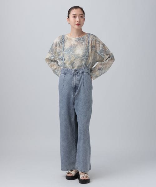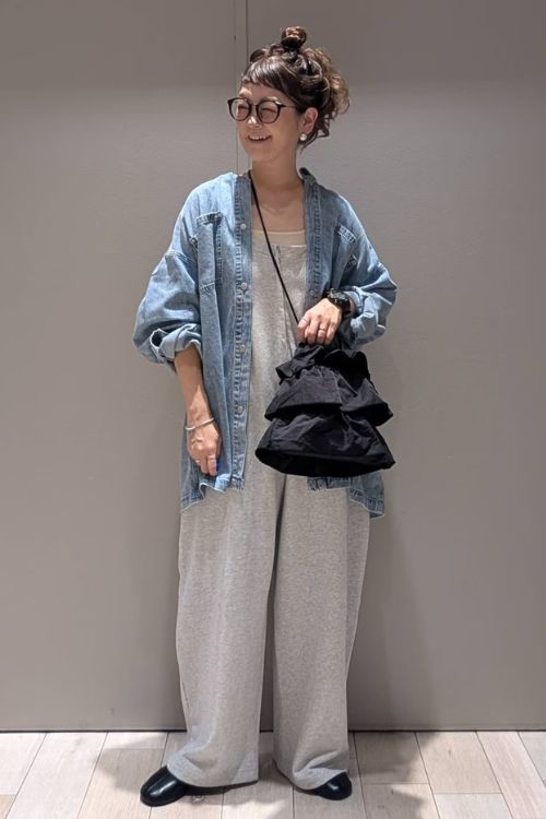 デニムシャツとオールインワンのカジュアルコーデは、フリルのバッグでガーリーさをプラスしています。