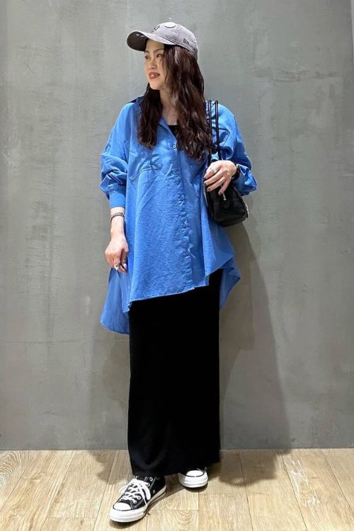 こなれ感あるチュニックシャツは、黒のナロースカートで縦のラインを引き締めて体形カバーにも貢献。
