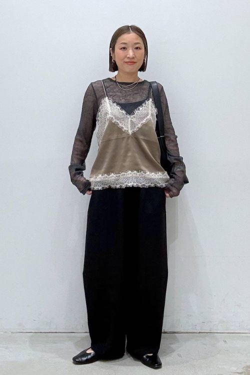 モードな印象のコクーンシルエットパンツのおかげで、レースのキャミも大人っぽい雰囲気です。