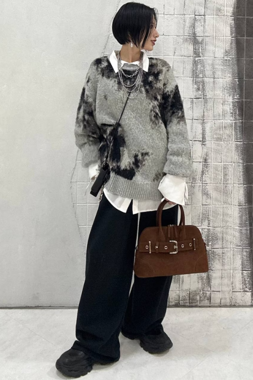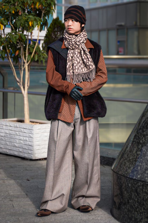 ゆったりとしたオーバーサイズめのボトムスに、目を引くトップスやマフラーが良いバランスを保っています。