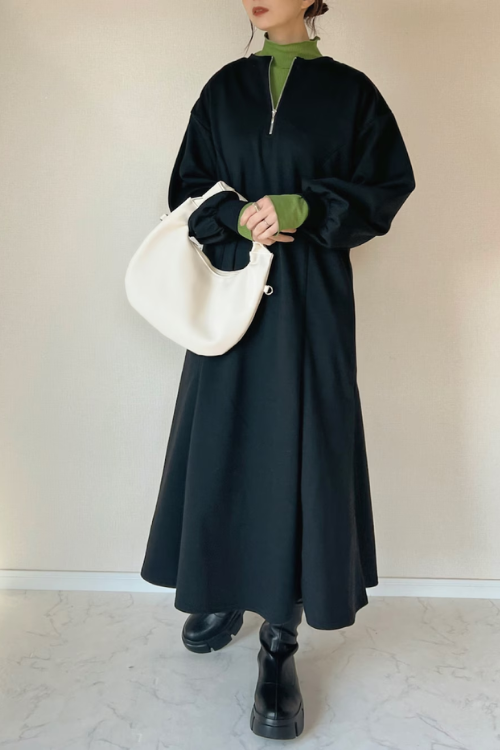 落ち着いた品のあるワンピースから見えるグリーンのトップスがよく映えて、大人っぽい洗練された雰囲気になっています。