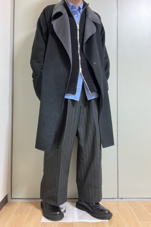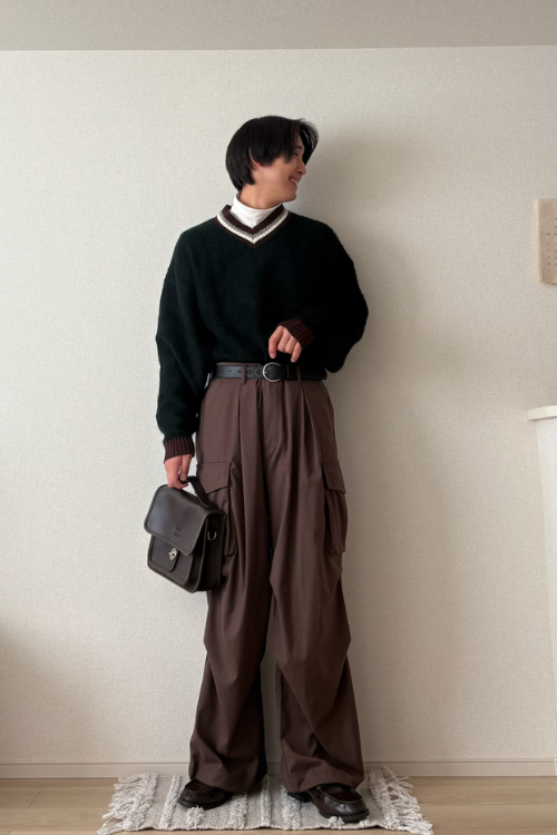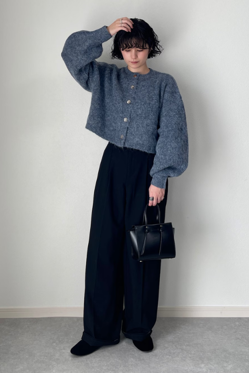 全体的にふんわりとしたシルエットですが、黒タートルでしっかりと引き締めつつネックレスがきれいめを演出している、バランスの取れたコーデになっていますね。