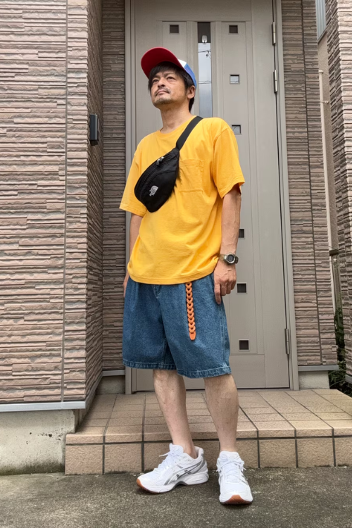 アクセントになるカラーのトップスと合わせたベルトが、よく映えるカジュアルコーデになっていますね。