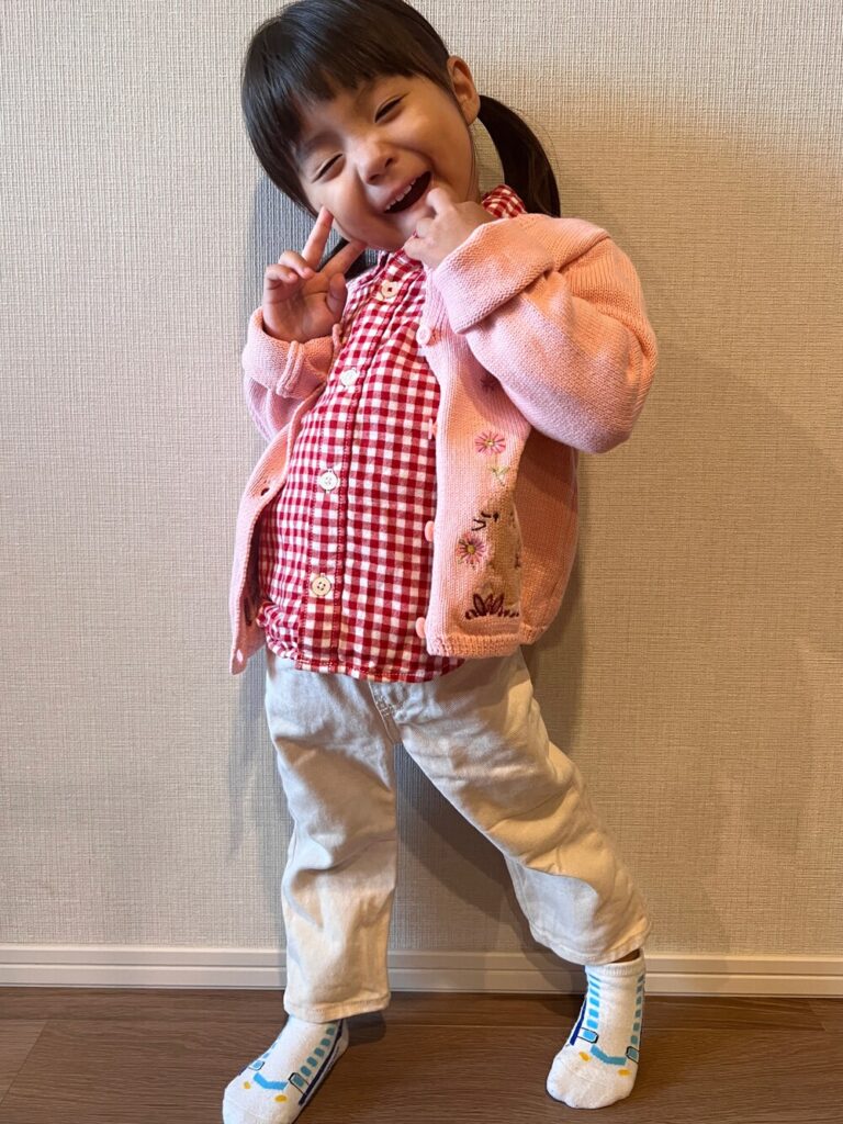 保育園着は「砂・泥・食べこぼし・名札の穴」で、1シーズンでボロボロになります。お出かけ用の勝負服は自宅用に分け、保育園用にはGUやバースデイなどの「安くておしゃれに見える服」を数枚混ぜておくと、朝の登園時から可愛い写真が撮れるのでおすすめです。