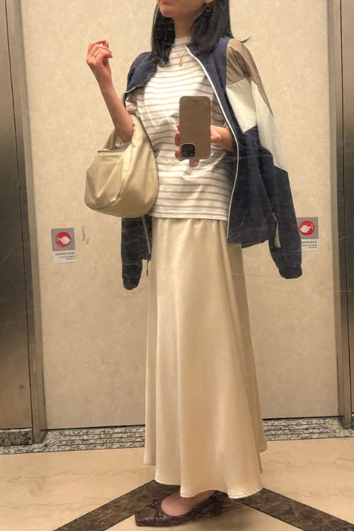 スポーティなブルゾンは、ベージュ系で全体とリンクさせることでスカートともうまくなじんでいます。