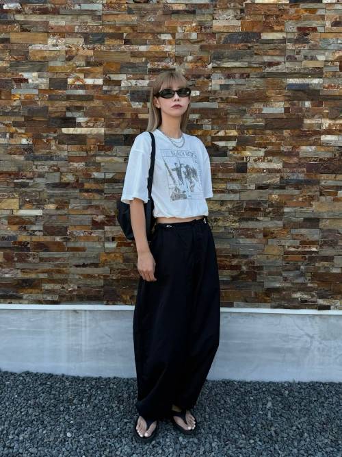 短め丈のシンプルなTシャツやカットソーをあわせると、トレンド感あるミニマムコーデに。