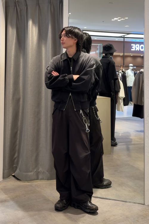トップスに短め丈のブルゾンを選ぶと、ボトムスのフォルムが引き立ってバランスよい着こなしになります。