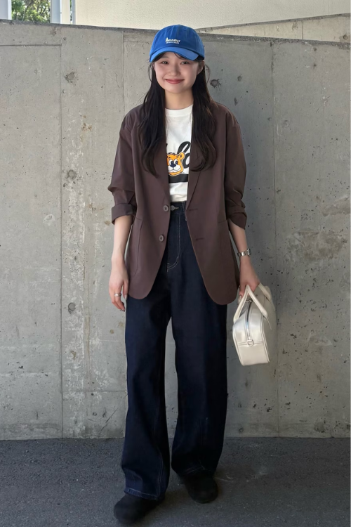 定番のカジュアルコーデにジャケットをさらりと羽織るだけで、大人の余裕を感じられます。