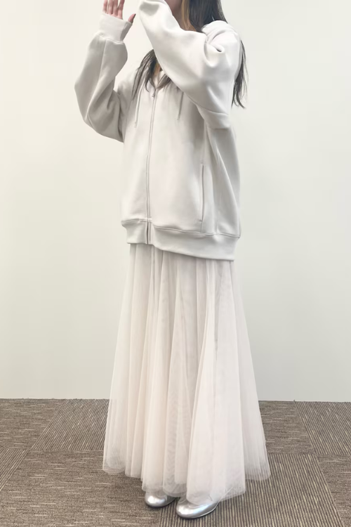 フェミニンなチュールスカートにゆったりとしたパーカーで、絶妙なミックスコーデが完成。