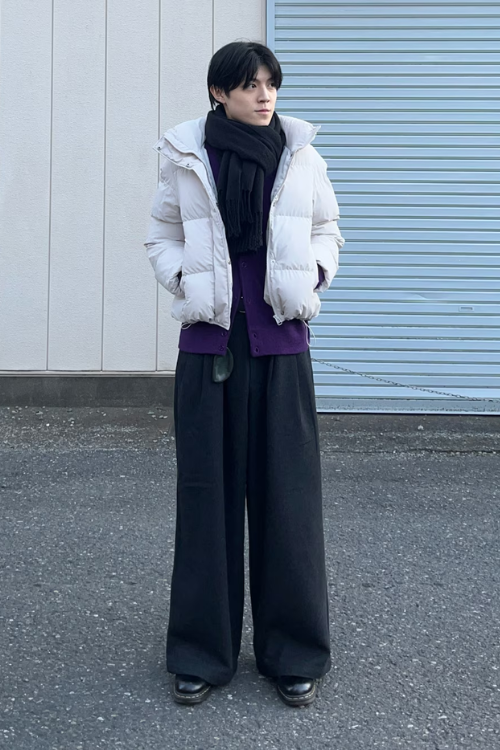 オールブラックコーデに、白のダウンがとても爽やかに映えています。