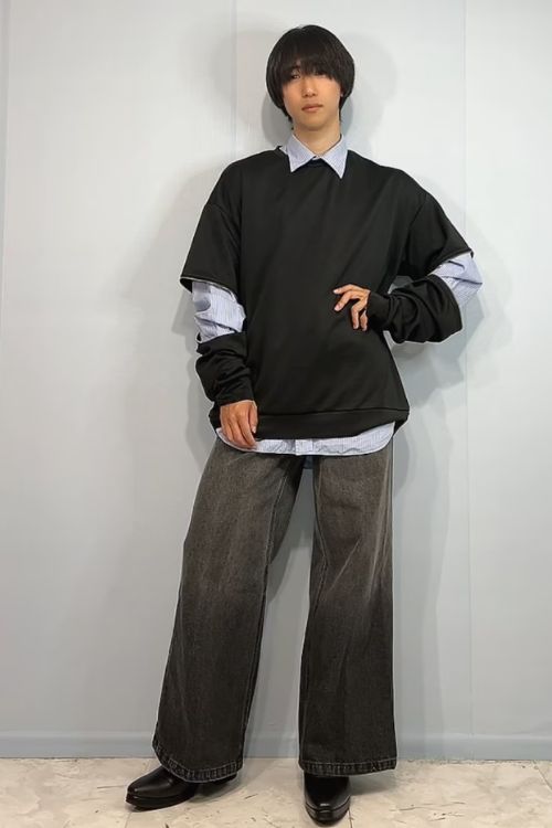 袖のファスナーを活かしたレイヤードスタイルは、きちんと感あるシャツをインしてモードな雰囲気です。