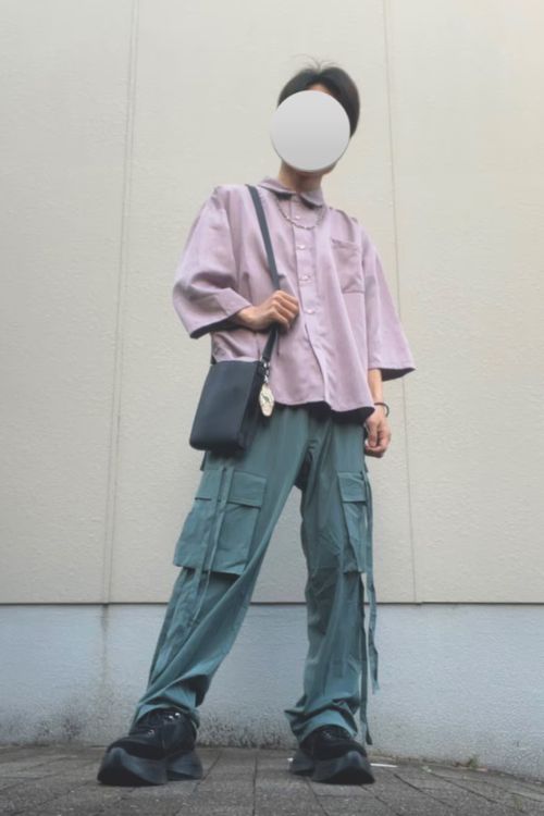 ポケットのデザインがインパクトあるカーゴパンツには、シンプルなカラーシャツをあわせて軽やかな着こなしに。