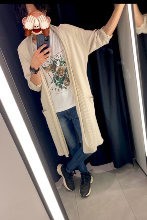 こちらの例ではインナーに黒Tシャツをのぞかせて、全体の雰囲気を引き締めています。