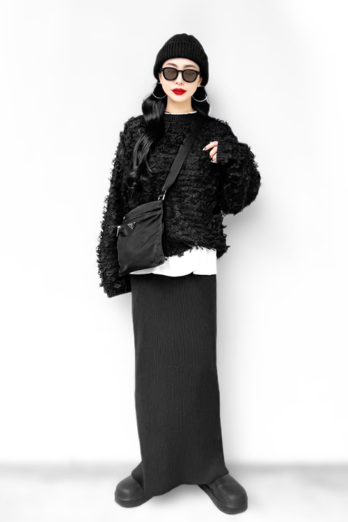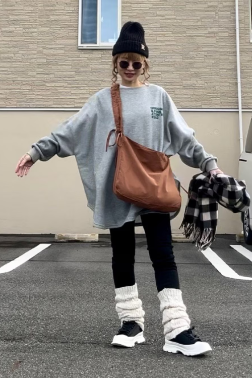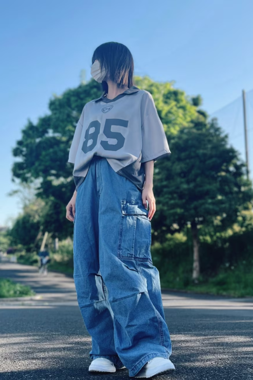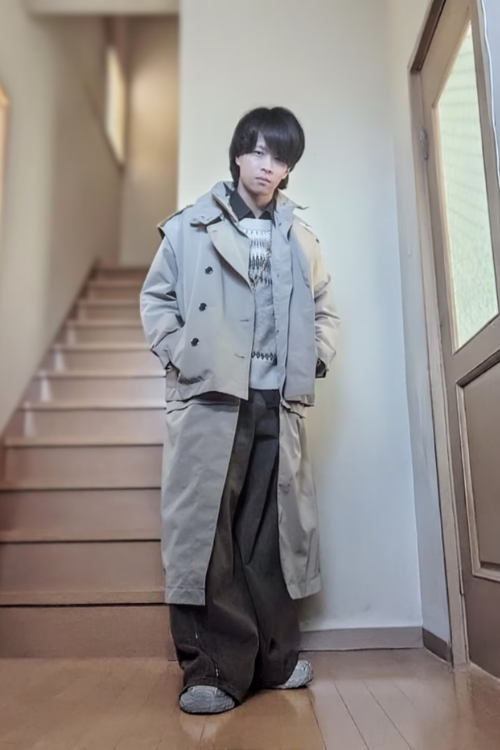 個性的な小物遣いでインパクトのあるコーデになっていますが、服も負けじと存在感を示しています。