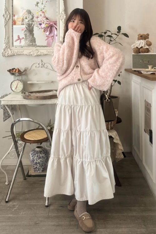 シンプルなデザインながら、ふんわりとしたシルエットと素材感でやわらかなフェミニンなコーデに。