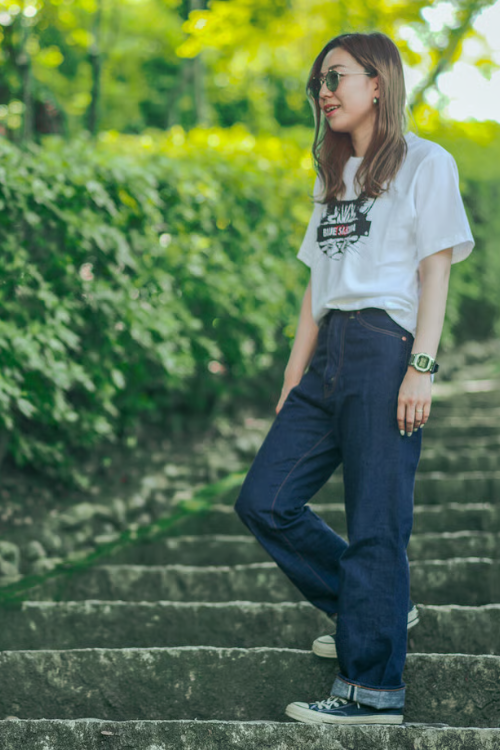 定番のTシャツとジーンズのスタイルですが、シルエットが程よくゆったりしており、リラクシーな印象を受けます。
