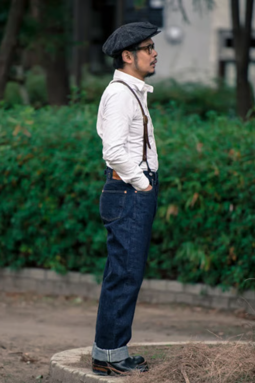 ロールアップしたジーンズにサスペンダーの組み合わせは野暮ったくなってしまうこともありますが、きれいめシャツとハットが程よく都会的な雰囲気をプラスしています。