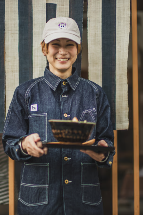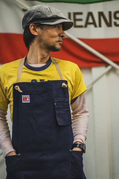ジーンズのエプロンは、意外性がありながらも、大人の余裕とこなれ感を演出できていますね。
