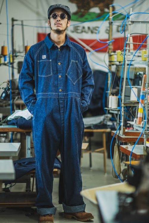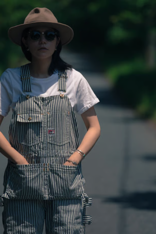 着こなすのが難しいつなぎタイプの服も、ジーンズ生地を使用することでおしゃれスタイルに。