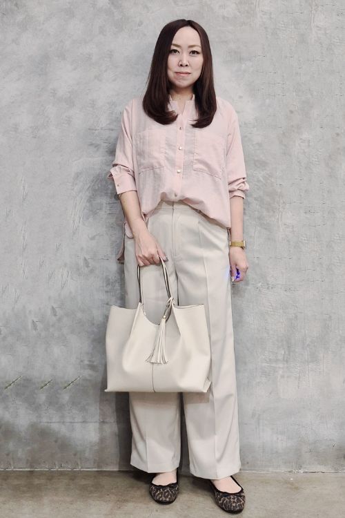 ピンク×ベージュの上品な配色コーデは、シャツをフロントインしてこなれ感をプラスしています。