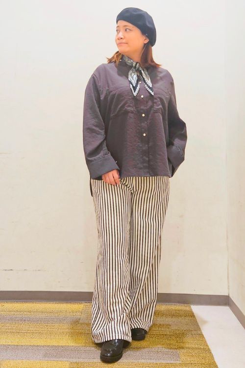 オーソドックスな無地のシャツは、ストライプのパンツやスカーフなどの小物で華やかさを演出。