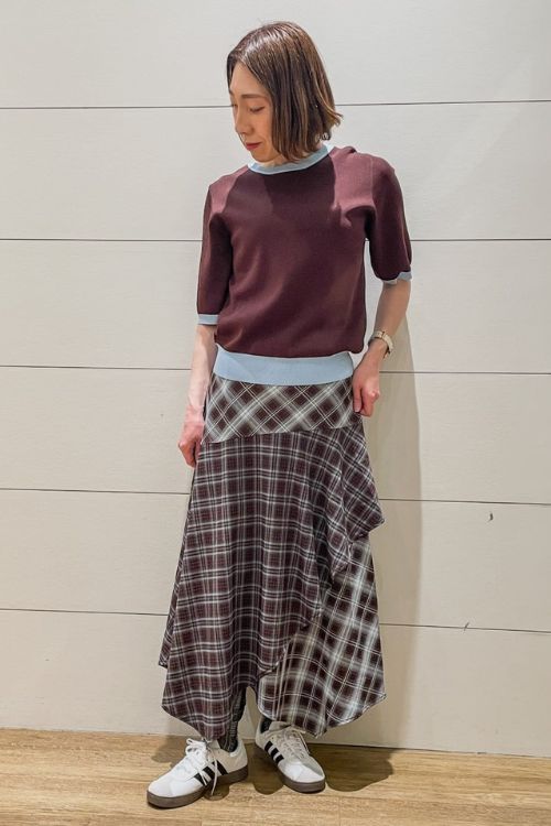 アシンメトリーの個性的なスカートには同系色のニットで統一感あるコーデに仕上がっています。