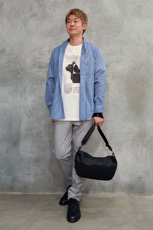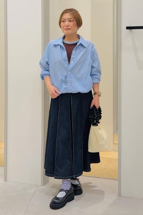 ラフに羽織ったシャツはインのTシャツと丈がぴったりで、カジュアルだけどきちんとした印象です。