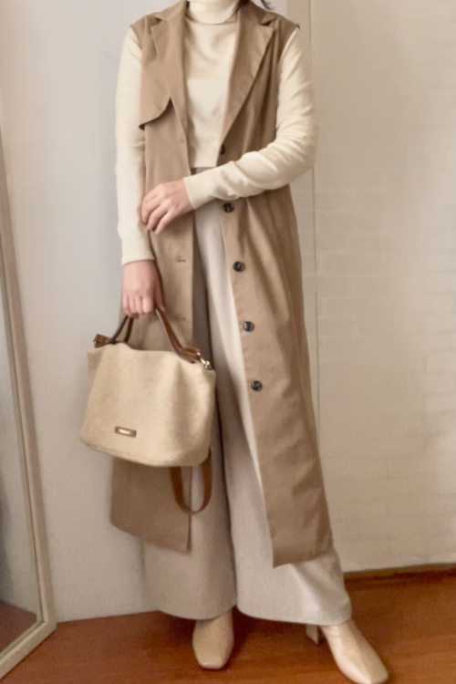 同系色でコーデをまとめ、さらにバッグのカラーも合わせることで、統一感と落ち着きがプラスされています。