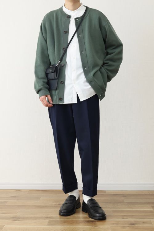 シューズとバッグをレザーであわせている点も、カジュアル過ぎずスタイリッシュな印象を与えます。