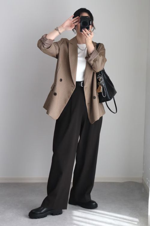 ジャケットとスラックスのきちんと感あるコーデは、ブラウン系のグラデーションで季節感も演出。