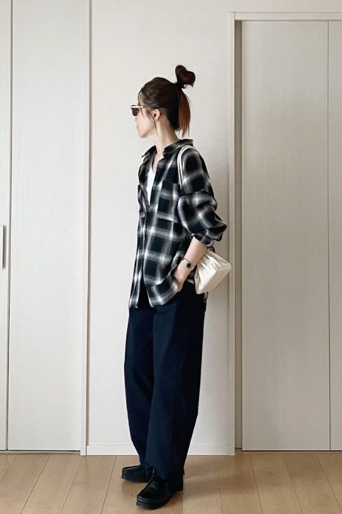 チェックシャツのカジュアルスタイルは、落ち着いたブルーのパンツで大人っぽくまとまっています。