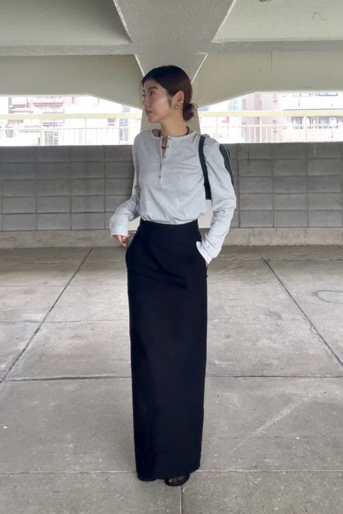 マキシ丈タイトスカートをあわせれば、オーソドックスなカットソーもモード系の雰囲気でかっこいい仕上がりに。