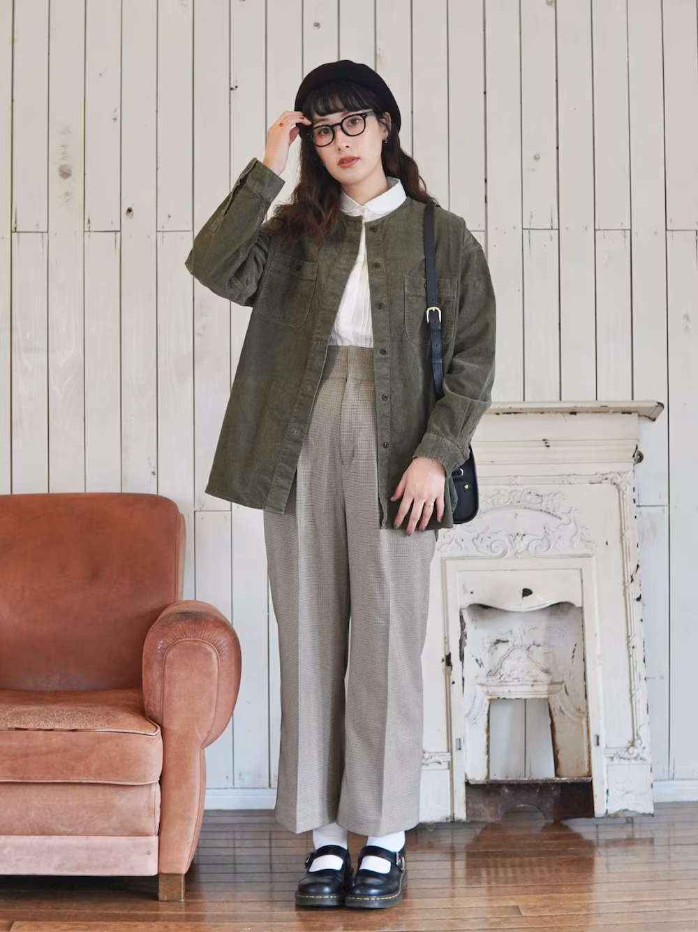 こちらの例ではベーシックなノーカラージャケットに、ベレーやメガネで知的な雰囲気を演出。