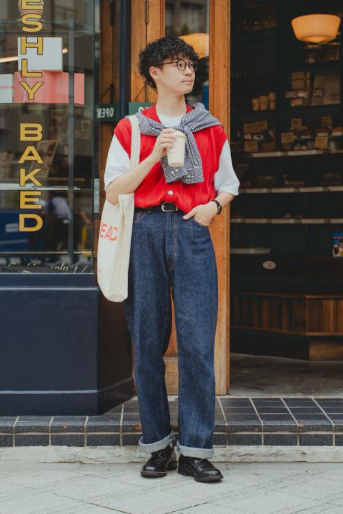 ぱっと目をひく印象的な赤いベストがジーンズ+Tシャツの定番コーデに個性をプラスしています。