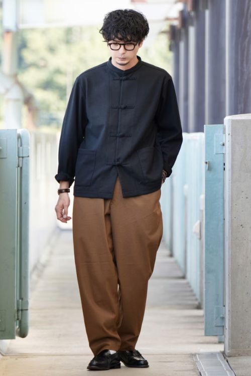 ブラックやブラウンといったシックなカラーには、チャイナ風シャツのボタンがほどよいアクセントに。