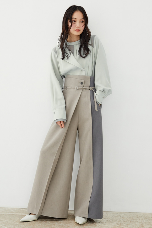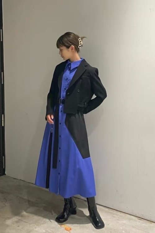 ふんわりとした女性らしいアウターに、独特な生地使いのボトムスがハンサムさをプラスする、ミックスコーデになっています。