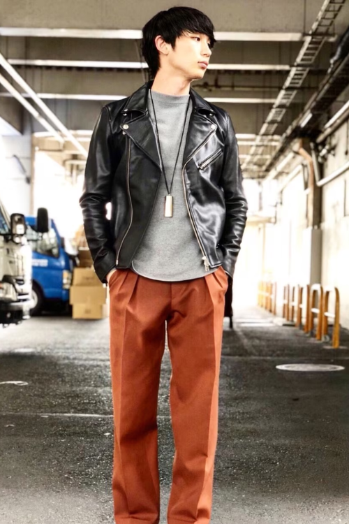 ワイルドな革ジャンも、明るい差し色を添えると乱暴さを感じず、品よくたたずむ雰囲気に。
